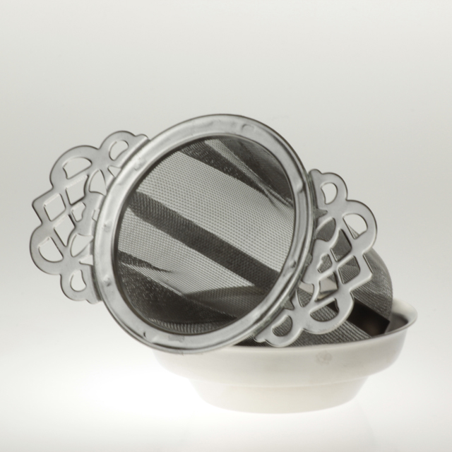 Prachtig vormgegeven theefilter met lekbakje van roestvrijstaal.
